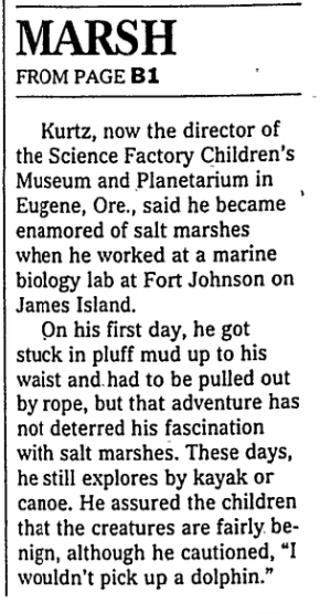 Kurtz, now the director of the Science Factory Children’s Museum and Planetarium in Eugene, Ore., said he became enamored of salt marshes when he worked as an assistant at the Department of Natural Resources on James Island’s Fort Johnson.