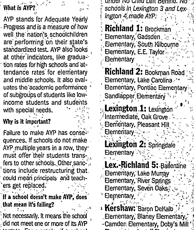 These Midlands schools met federal improvement standards under No Child Left Behind. No schools in Lexington 3 and Lexington 4 made AYP.