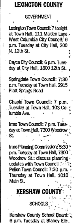 Lexington Town Council: 7 tonight at Town Hall, 111 Maiden Lane West Columbia City Council: 6 p.m. Tuesday at City Hall, 200 N. 12th St.
