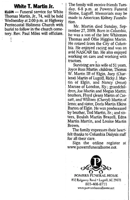 ELGIN – Funeral service for White Thomas Martin, Jr., 74, will be held Wednesday at 2:00 p.m. at Highway Pentecostal Holiness Church with burial to follow in the church cemetery. Rev. Paul Miles will officiate. The family will receive friends Tuesday, 6-8 p.m. at Powers Funeral Home, Lugoff. Memorials may be made to American Kidney Foundation.