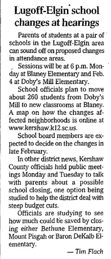 In other district news, Kershaw County officials held public meetings Monday and Tuesday to talk with parents about a possible school closing, one option being studied to help the district deal with steep budget cuts.