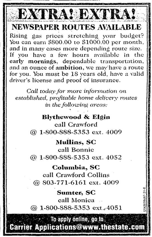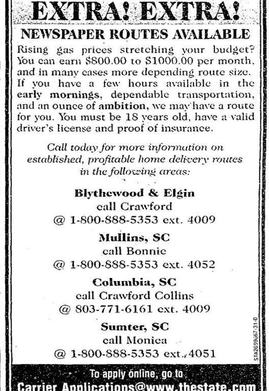 Rising gas prices stretching your budget? You can earn $800.00 to $1000.00 per month, and in many cases more depending route size. If you have a few hours available in the early morning, dependable transportation and an ounce of ambition, we may have a route for you. You must be 18 year old, have a valid driver’s license and proof of insurance.