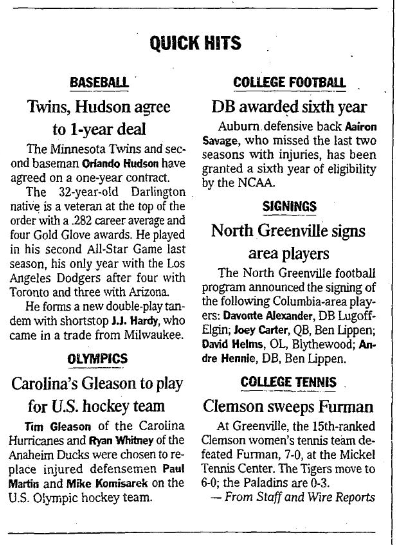 The Minnesota Twins and second baseman Orlando Hudson have agreed on a one-year contract. The 32-year-old Darlington native is a veteran at the top of the order with a .282 career average and four Gold Glove awards. He played in his second All-Star Game last season, his only year with the Los Angeles Dodgers after four with Toronto and three with Arizona. He forms a new double-play tandem with shortstop J.J. Hardy, who came in a trade from Milwaukee.