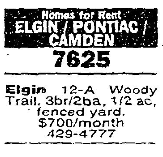 Today in HistoryHomes for Rent ELGIN / PONTIAC / CAMDEN 7625 Elgin 12-A Woody Trail, 3br/2ba, 1/2 ac, fenced yard $700/month 429-4777 February 6, 2010 State (published as The State) Columbia, South CarolinaPage 49