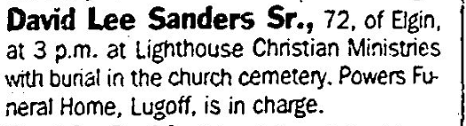 David Lee Sanders Sr., 72, Elgin, at 3 p.m. at Lighthouse Christian Ministries with burial in the church cemetery. Powers Funeral Home, Lugoff, is in charge.