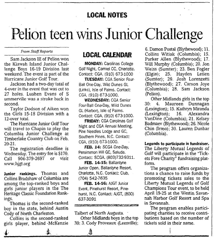 Sam Jackson III of Pelion won the Kiawah Island Junior Challenge Boys 16-19 Division last weekend. The event is part of the Hurricane Junior Golf Tour.