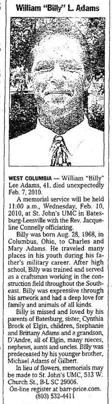 WEST COLUMBIA – William “Billy” Lee Adams, 41, died unexpectedly Feb. 7, 2010.