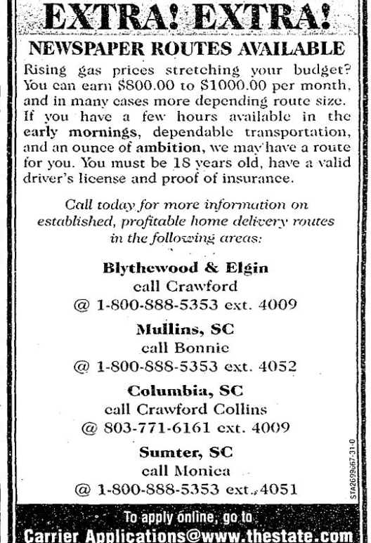 NEWSPAPER ROUTES AVAILABLE Rising gas prices stretching your budget? You can earn $800.00 to $1000.00 per month, and in many cases more depending route size. If you have a few hours available in the early morning, dependable transportation and an ounce of ambition, we may have a route for you. You must be 18 year old, have a valid driver’s license and proof of insurance. … Continue reading EXTRA! EXTRA!