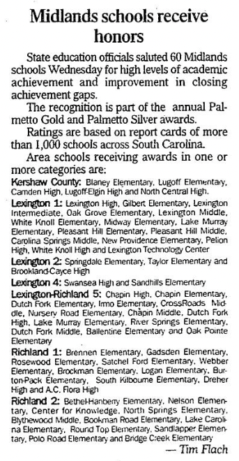Lexington-Richland 5: Chapin High, Chapin Elementary, Dutch Fork Elementary, Irmo Elementary, CrossRoads Middle, Nursery Road Elementary, Chapin Middle, Dutch Fork High, Lake Murray Elementary, River Springs Elementary, Dutch Fork Middle, Ballentine Elementary and Oak Pointe Elementary Richland 1: Brennen Elementary, Gadsden Elementary, Rosewood Elementary, Satchel Ford Elementary, Webber Elementary, Brockman Elementary, Logan Elementary, Burton-Pack Elementary, South Kilbourne Elementary, Dreher High and A.C. Flora High Richland 2: Bethel-Hanberry Elementary, Nelson Elementary, Center for Knowledge, North Springs Elementary, Blythewood Middle, Bookman Road Elementary, Lake Carolina Elementary, Round Top Elementary, Sandlapper Elementary, Polo Road Elementary and Bridge Creek Elementary