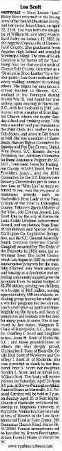She graduated from Angelus High School and attended Winthrop College. The state of South Carolina is far better off for “Lou” being born on that rural stretch of Chesterfield County. Described as a “Sermon in Shoe Leather” by a former pastor, Lou Scott dedicated her every waking moment to serving others. She began her mission as a school teacher in Blaney, S.C., worked in the Pentagon during World War II, and found her true calling upon moving to Hartsville, S.C. with her husband in 1949.