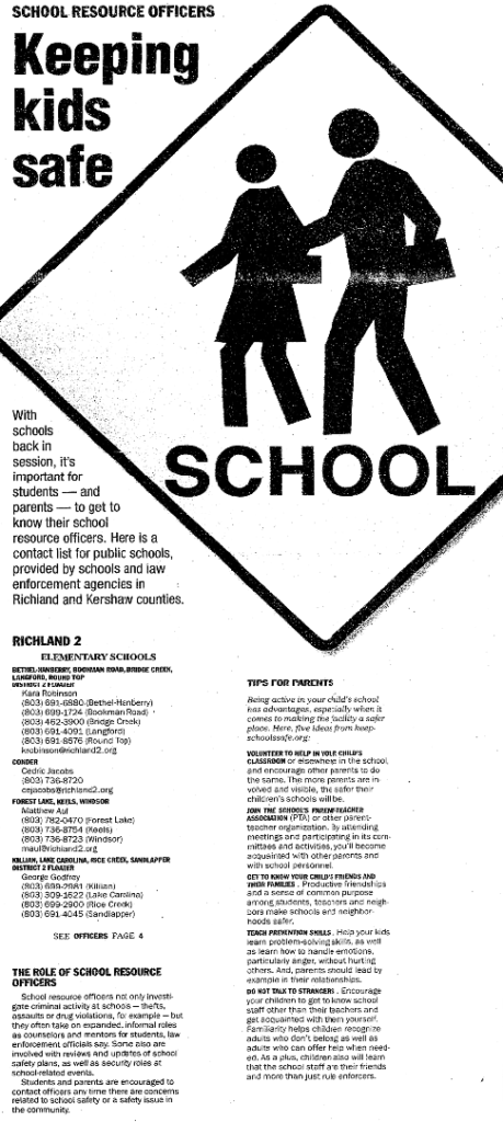 With schools back in session, it’s important for students – and parents – to get to know their school resource officers. Here is a contact list for public schools, provided by schools and law enforcement agencies in Richland and Kershaw counties.