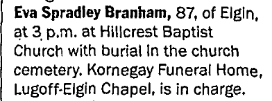 Funeral services for Eva Spradley Branham, 87, of Elgin, will be held at 3:00 PM Monday, October 11, 2010 at Hillcrest Baptist Church. Burial will follow in the church cemetery. Reverend Ken Jackson and Reverend Ron Taylor will officiate. Pastor Joseph Covino will also speak. Active pallbearers will be James Rabon, Eric Watts, Ray Garza, Justin Garza, Jerry Love and Randy Watts. Memorials may be made in Mrs. Branham’s memory to Calvary Community Church, c/o Vickie Covino, 1177 Jordan Road, Lugoff, SC 29078.