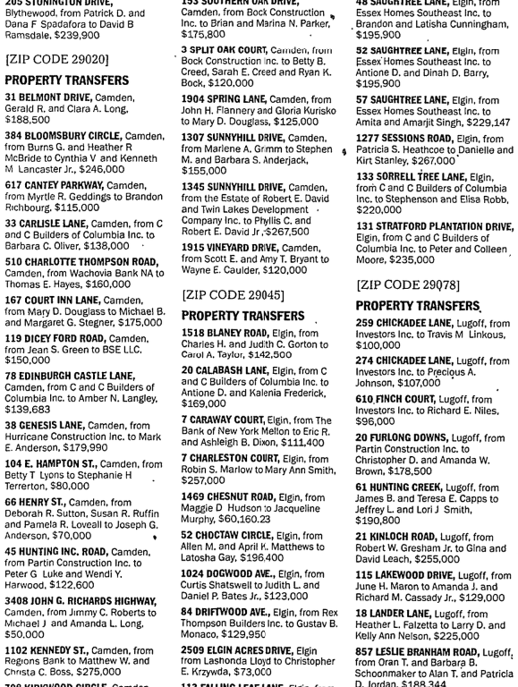 20 CALABASH LANE, Elgin, from C and C Builders of Columbia Inc. to Antione D. and Kalenia Frederick, $169,000