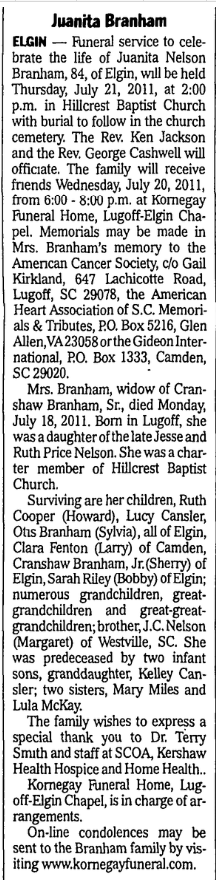 Surviving were her children, Ruth Cooper (Howard), Lucy Cansler, Otis Branham ( Sylvia) all of Elgin, Clara Fenton ( Larry) of Camden, Cranshaw Branham, Jr.( Sherry) of Elgin, Sarah Riley (Bobby) of Elgin; numerous grandchildren, great-grandchildren and great-great-grandchildren; brother, J.C. Nelson (Margaret Catoe Nelson) of Westville, SC. She was predeceased by 2 infant sons, granddaughter, Kelley Cansler; 2 sisters, Mary Miles and Lula McKay.