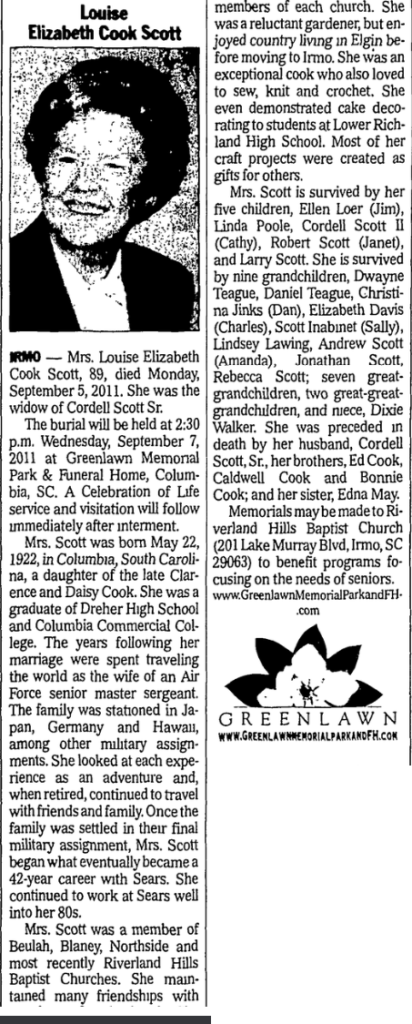 IRMO – Mrs. Louise Elizabeth Cook Scott, 89, died Monday, September 5, 2011. She was the widow of Cordell Scott Sr.
