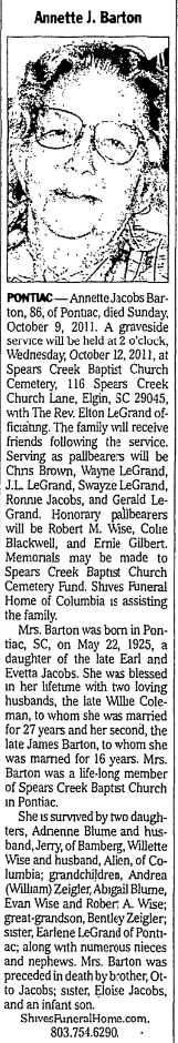 PONTIAC – Annette Jacobs Barton, 86, of Pontiac, died Sunday, October 9, 2011. A graveside service will be held at 2 o’clock, Wednesday, October 12, 2011, at Spears Creek Baptist Church Cemetery, 116 Spears Creek Church Lane, Elgin, SC 29045, with The Rev. Elton LeGrand officiating. The family will receive friends following the service. Serving as pallbearers will be Chris Brown, Wayne LeGrand, J.L. LeGrand, Swayze LeGrand, Ronnie Jacobs, and Gerald Le-Grand. Honorary pallbearers will be Robert M. Wise, Colie Blackwell, and Ernie Gilbert. Memorials may be made to Spears Creek Baptist Church Cemetery Fund. Shives Funeral Home of Columbia is assisting the family.