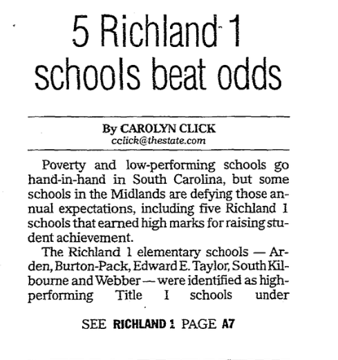 The Richland 1 elementary schools – Arden, Burton-Pack, Edward E. Taylor, South Kilbourne and Webber – were identified as high-performing Title I schools under