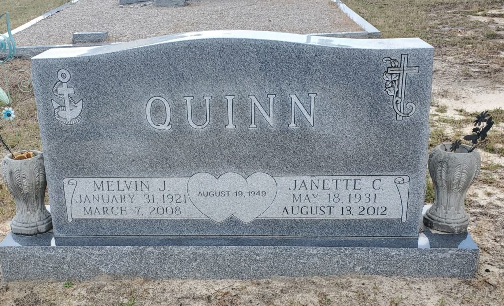 She was predeceased by her husband of 58 years, Melvin Joseph Quinn; daughter, Annette Marie Rish; brothers, Herman Cogdell, Steve Cogdell and Ernest Cogdell and brother-in-laws, Frank Griffie and Langford Peake.
