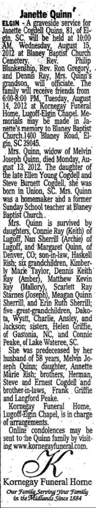 ELGIN – A graveside service for Janette Cogdell Quinn, 81, of Elgin, SC, will be held at 10:00 AM, Wednesday, August 15, 2012 at Blaney Baptist Church Cemetery. Rev. Philip Blankenship, Rev. Ron Gregory, and Dennis Ray, Mrs. Quinn’s grandson, will officiate. The family will receive friends from 6:00-8:00 PM, Tuesday, August 14, 2012 at Kornegay Funeral Home, Lugoff-Elgin Chapel. Memorials may be made in Janette’s memory to Blaney Baptist Church.1400 Blaney Road, Elgin, SC 29045.