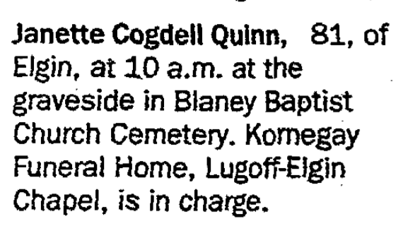 June 30, 2007, Janette Cogdill Quinn was listed as a living mother in the obituary of Marie Quinn Rish.