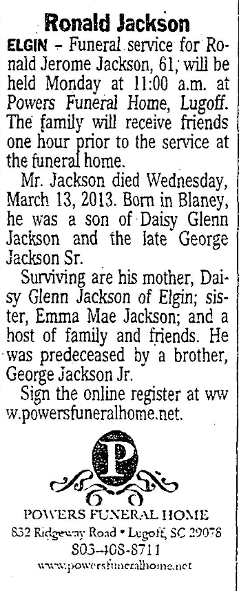 ELGIN – Funeral service for Ronald Jerome Jackson, 61, will be held Monday at 11:00 a.m. at Powers Funeral Home, Lugoff. The family will receive friends one hour prior to the service at the funeral home.