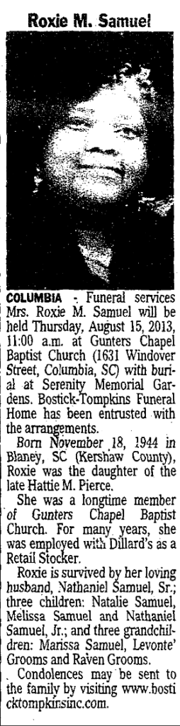 COLUMBIA – Funeral services Mrs. Roxie M. Samuel will be held Thursday, August 15, 2013, 11:00 a.m. at Gunters Chapel Baptist Church (1631 Windover Street, Columbia, SC) with burial at Serenity Memorial Gardens. Bostick-Tompkins Funeral Home has been entrusted with the arrangements.