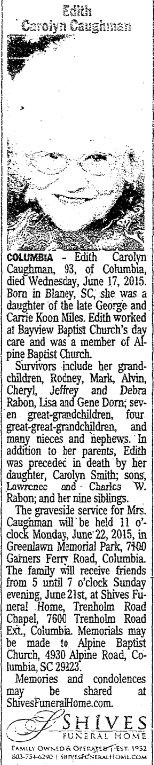 Edith Carolyn Caughman, 93, of Columbia, died Wednesday, June 17, 2015. Born April 20, 1922 in Blaney, SC, she was a daughter of the late George Miles and Carrie Koon Miles. Edith worked at Bayview Baptist Church’s day care and was a member of Alpine Baptist Church.