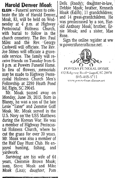 He was predeceased by a son, Harold Anthony Moak; brother, Ernie Moak; and a sister, Mae Rose.