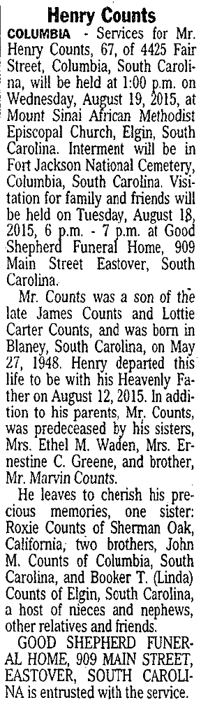Mr. Counts was a son of the late James Counts and Lottie Carter Counts, and was born in Blaney, South Carolina, on May 27, 1948. Henry departed this life to be with his Heavenly Father on August 12, 2015. In addition to his parents, Mr. Counts, was predeceased by his sisters, Mrs. Ethel M. Waden, Mrs. Ernestine C. Greene, and brother, Mr. Marvin Counts.