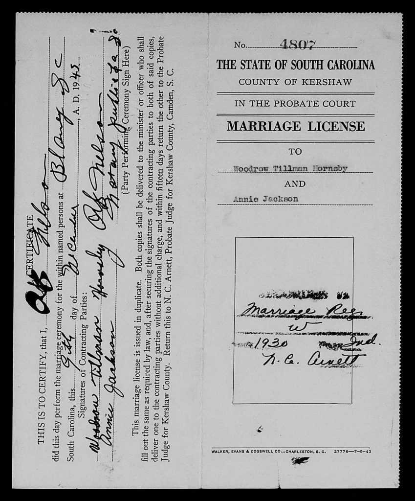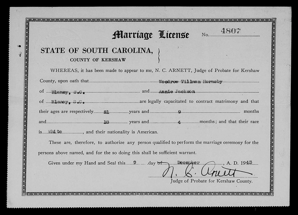 When she was 18, she married Woodrow Tilman Hornsby, son of Joseph Tillman Hornsby and Emily Bowen, on 09 Dec 1943 in Elgin, Kershaw, South Carolina, USA.