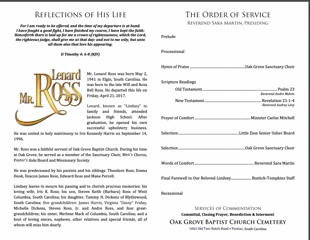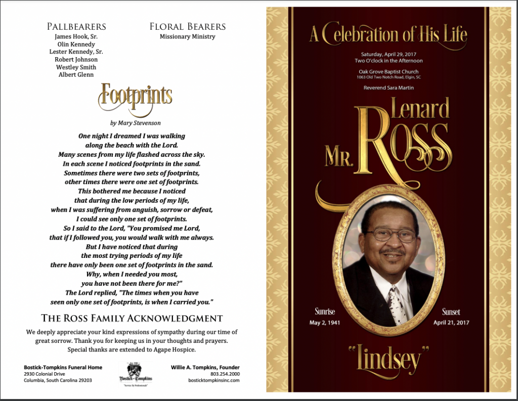Lindsey leaves to mourn his passing and to cherish precious memories: his loving wife, Iris K. Ross; his son, Steven Keith (Barbara) Ross of West Columbia, South Columbia, South Carolina; his daughter, Tammy H. Dickens of Blythewood, South Carolina; five grandchildren: James Harris, Virginia “Ginny” Friday, Michelle Dickens, Steven Ross, Jr. and Andre Ross, and four great-grandchildren; his sister, Merlene Mack of Columbia, South Carolina; and a host of loving nieces, nephews, other relatives and special friends, all of whom will miss him dearly.