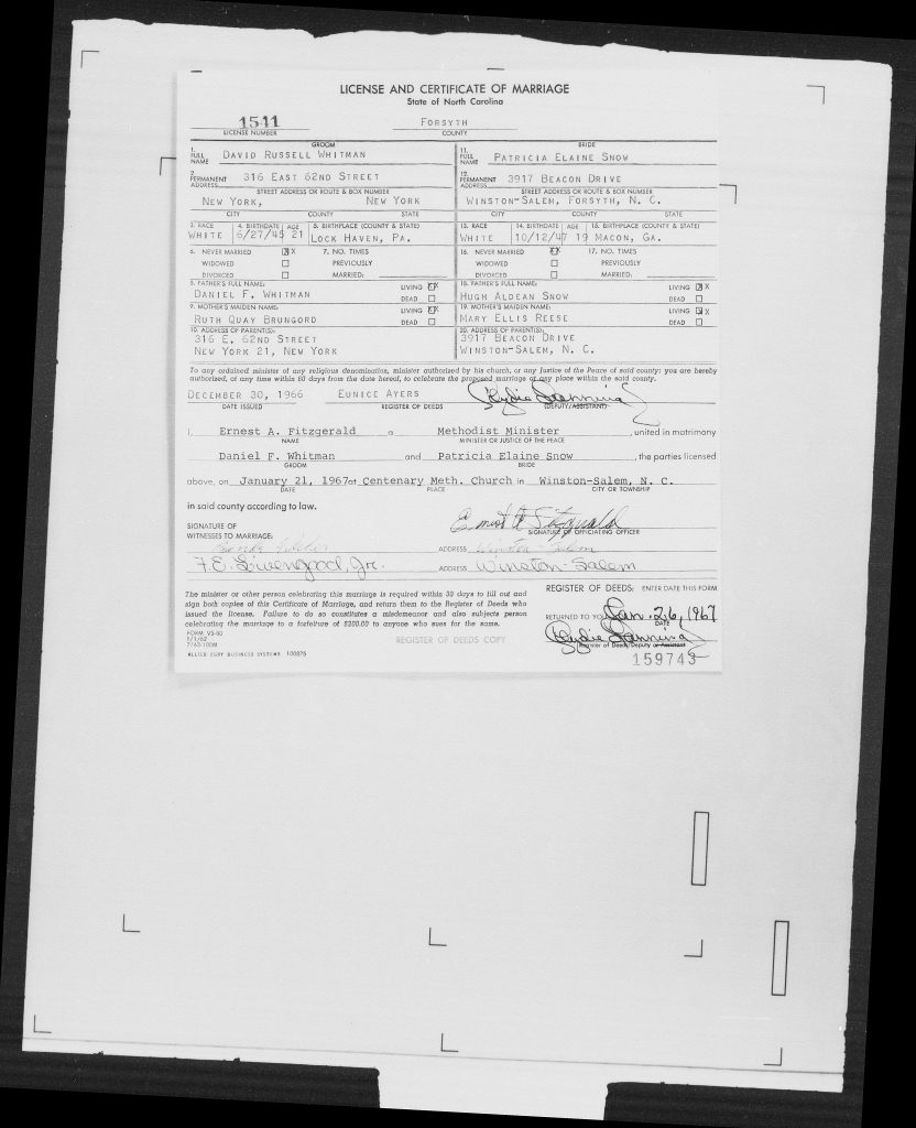 When she was 19, she married David Russell Whitman, son of Daniel F Whitman and Ruth Quay Brungord Whitman, on 21 Jan 1967 in Winston-Salem, Forsyth, North Carolina, USA at Centenary United Methodist Church.