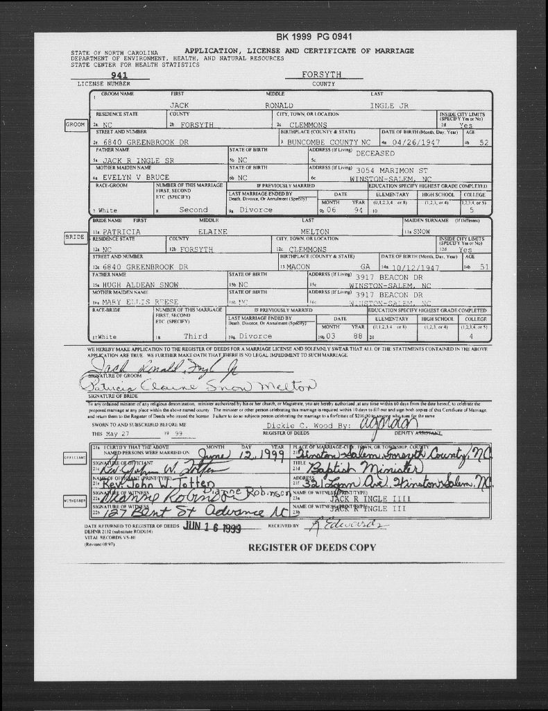 When she was 51, she married Jack Ronald Ingle Jr, son of Jack Ronald Ingle Sr and Evelyn N Bruce Ingle, on 12 Jun 1999 in Winston-Salem, Forsyth, North Carolina, USA.
