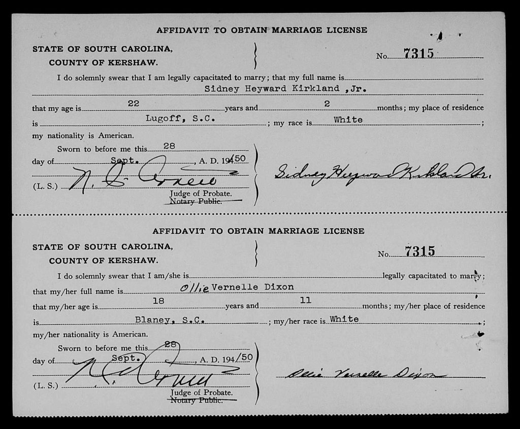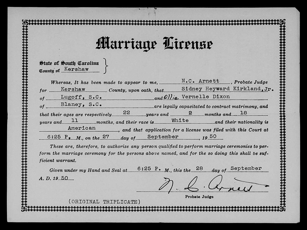 On September 28, 1950, Sidney Heyward Kirkland and Ollie Vernelle Dixon were married in Kershaw, South Carolina.