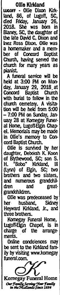 LUGOFF – Ollie Dixon Kirkland, 86, of Lugoff, SC, died Friday, January 26, 2018. She was born in Blaney, SC, the daughter of the late David C. Dixon and Inez Ross Dixon. Ollie was a homemaker and a member of Concord Baptist Church, having served the church for many years as pianist.