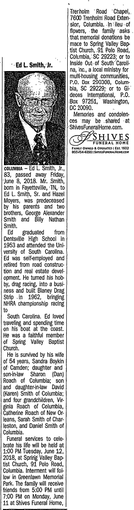 Ed graduated from Dentsville High School in 1953 and attended the University of South Carolina. Ed was self-employed and retired from road construction and real estate development. He turned his hobby, drag racing, into a business and built Blaney Drag Strip in 1962, bringing NHRA championship racing to South Carolina. Ed loved traveling and spending time on his boat at the coast. He was a faithful member of Spring Valley Baptist Church.