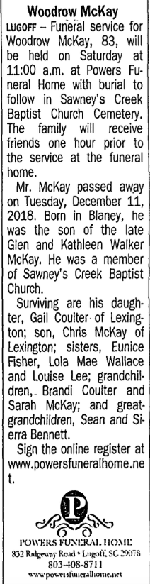 LUGOFF – Funeral service for Woodrow McKay, 83, will be held on Saturday, December 15, 2018 at 11:00 a.m. at Powers Funeral Home with burial to follow in Sawney’s Creek Baptist Church Cemetery. The family will receive friends one hour prior to the service at the funeral home.