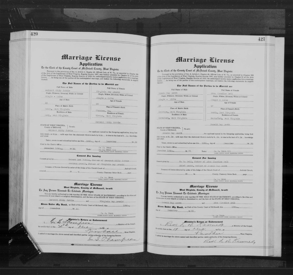 On December 20, 1950 in McDowell County, West Virginia, Ernest Billy Tuttle and Virginia Gay Arnold were married.