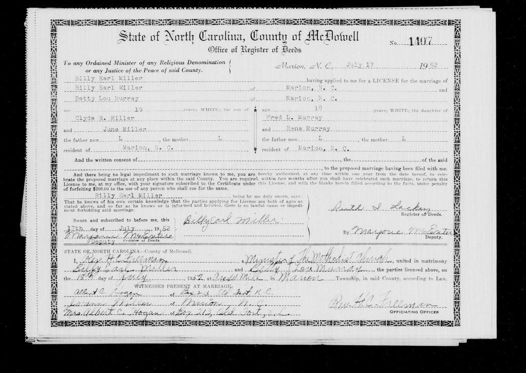 On July 17, 1952, Billy Earl Miller and Betty Lou Murray were married in Marion, McDowell County, North Carolina.