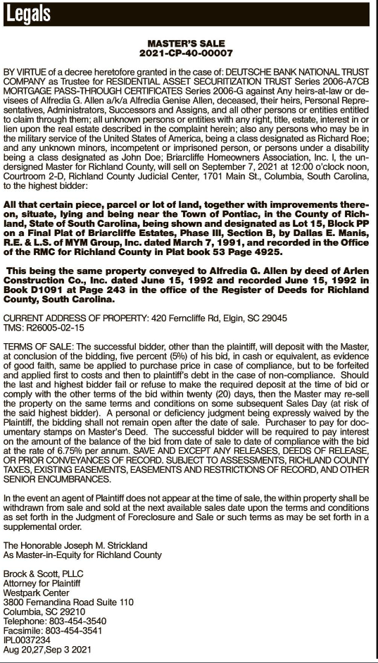 BY VIRTURE of a decree heretofore granted in the case of: DEUTSCHE BANK NATIONAL TRUST COMPANY as Trustee for RESIDENTIAL ASSET SECURITIZATION TRUST Series 2006-A7CB MORTGAGE PASS-THROUGH CERTIFICATES Series 2006-G against Any heirs-at-law or devisees of Alfredia G. Allen a/k/a Alfredia Genise Allen, deceased, their heirs, Personal Representative, Adminstrators, Successors and Assigns, and all other persons or entities entitled to claim through them; all unknown persons or entities with any right, title, estate, interest in or lien upon the real estate described in the complaint herein; also any persons who may be in the military service of the United States of America, being a class designated as Richard Roe; and any unknown minors, incompetent or imprisoned person, or persons under a disability being a class designated as John Doe; Briarcliffe Homeowners Association, Inc. I, the undersigned Master for Richland County, will sell on September 7, 2021 at 12:00 o’clock noon, Courtroom 2-D, Richland County Judicial Centery, 1701 Main St., Columbia, South Carolina, to the highest bidder: