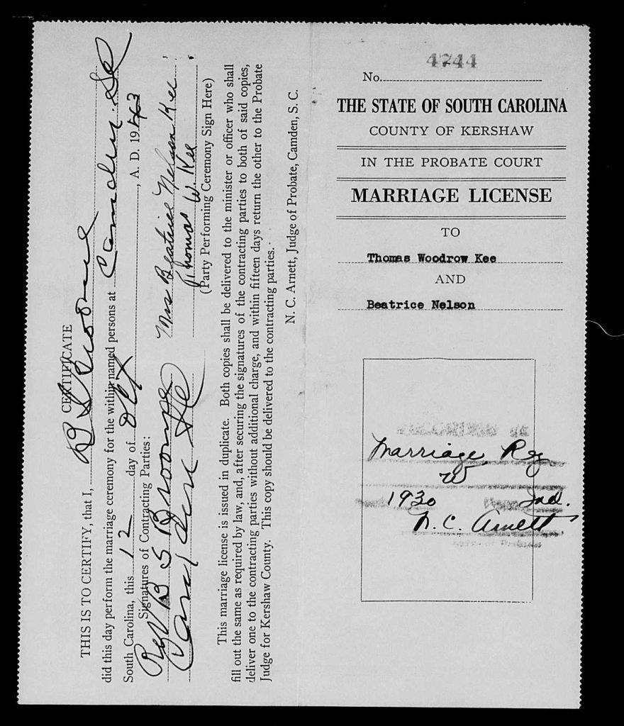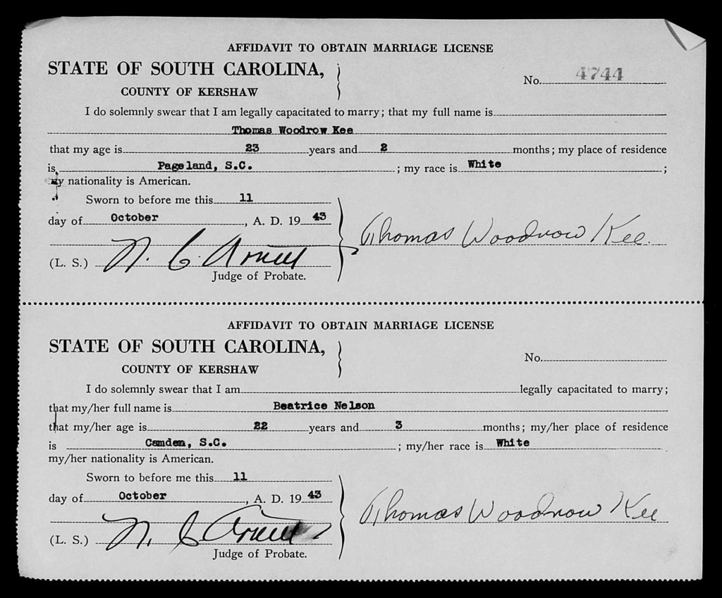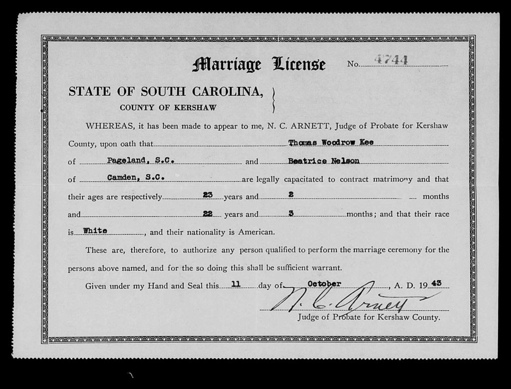 Thomas Woodrow Kee was born on 11 Aug 1920 in Jefferson, Chesterfield, South Carolina, USA a child of Willie H. Kee and Magnolia Carnes Kee.