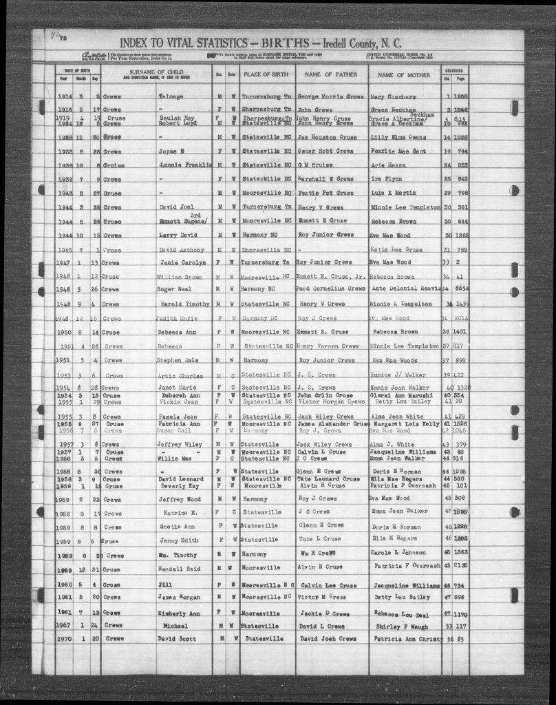 Joyce Yvonne Crews was born on 26 Aug 1933 in Statesville, Iredell, North Carolina, USA as the first child of Oscar Robert Crews and Pearlie Mae Gant Crews.