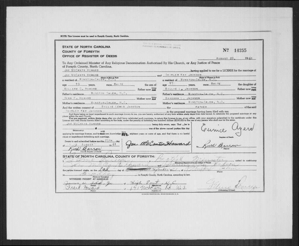 When she was 17, she married Joe McCants Howard, son of William C Howard and Reba F, on 02 Sep 1961 in Winston-Salem, Forsyth, North Carolina, USA.