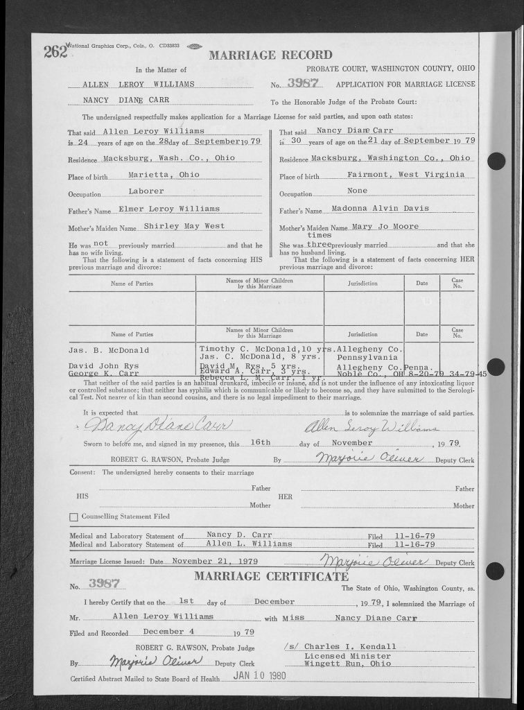 “Ohio, County Marriages, 1789-2016,” database with images, FamilySearch (https://familysearch.org/ark:/61903/3:1:3Q9M-C95X-ZSCJ-Z?cc=1614804&wc=ZRZ1-929%3A122395301%2C1556382601 : 14 July 2022), Washington > Marriage records 1979 vol 41 > image 324 of 715; county courthouses, Ohio.