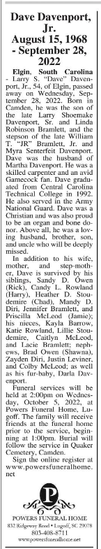 Larry S. “Dave” Davenport, Jr., 54, of Elgin, passed away on Thursday, September 29, 2022. Born in Camden, he was the son of the late Larry Shoemake Davenport, Sr. and Linda Robinson Bramlett, and the stepson of the late William T. “JR” Bramlett, Jr. and Myra Senterfeit Davenport. Dave was the husband of Martha Davenport. He was a skilled carpenter and an avid Gamecock fan. Dave graduated from Central Carolina Technical College in 1992. He also served in the Army National Guard. Dave was a Christian and was also proud to be an organ and bone donor. Above all, he was a loving husband, brother, son, and uncle who will be deeply missed.