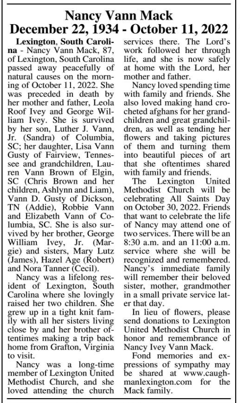 Nancy Vann Mack, 87, of Lexington, South Carolina passed away peacefully of natural causes on the morning of October 11, 2022. She was preceded in death by her mother and father, Leola Roof Ivey and George William Ivey. She is survived by her son, Luther J. Vann, Jr. (Sandra) of Columbia, SC; her daughter, Lisa Vann Gusty of Fairview, Tennessee and grandchildren, Lauren Vann Brown of Elgin, SC (Chris Brown and her children, Ashlynn and Liam), Vann D. Gusty of Dickson, TN (Addie), Robbie Vann and Elizabeth Vann of Columbia, SC. She is also survived by her brother, George William Ivey, Jr. (Margie) and sisters, Mary Lutz (James), Hazel Age (Robert) and Nora Tanner (Cecil).