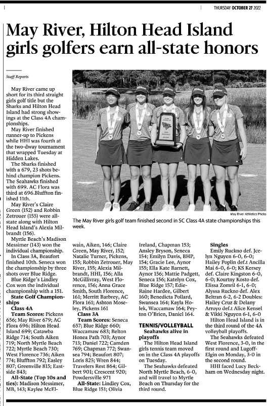 May River’s Claire Green (152) and Robbin Zetrouer (155) were all-state along with Hilton Head Island’s Alexia Milbrandt (156).