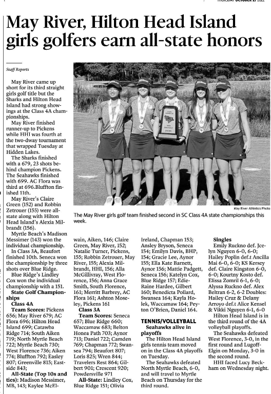 All-State (Top 10s and ties): Madison Messimer, MB, 143; Kaylee McElwain, Aiken, 146; Claire Green, May River, 152; Natalie Turner, Pickens, 155; Robbin Zetrouer, May River, 155; Alexia Milbrandt, HHI, 156; Alla McGillivray, West Florence, 156; Anna Grace Smith, South Florence, 161; Merritt Barbrey, AC Flora 161; Ashton Moseley, Pickens 161