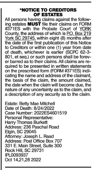 All persons having claims against the following estates MUST file their claims on FORM #371ES with the Probate Court of YORK County, the address of which is P. O. Box 219, York SC 29745, within eight (8) months after the date of the first publication of this Notice to Creditors or within one (1) year from date of date, whichever is earlier (SCPC 62-3-801, et seq.) or such persons shall be … Continue reading *NOTICE TO CREDITORS OF ESTATES