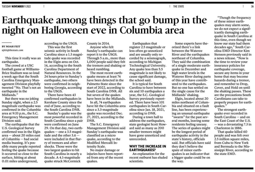 Elgin, located about 20 miles northeast of Columbia and situated on a fault line, has been experiencing an unusual earthquake “swarm” for the past several months, leaving some residents feeling uneasy. The series of quakes might be the longest period of earthquake activity in the state’s history, officials said. But officials have said they don’t believe the spate of minor earthquakes is an indicator that a bigger quake could be on the way.